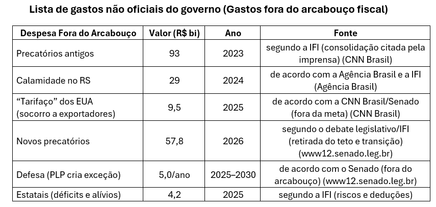 A seguir, o miolo do problema: a lista de gastos considerados “exceções” que “não entram na meta” do arcabouço fiscal, mas entram na consolidação da dívida efetuada pelo Banco Central. O mapeamento foi consolidado com base nas contas do IFI e em atos já aprovados.