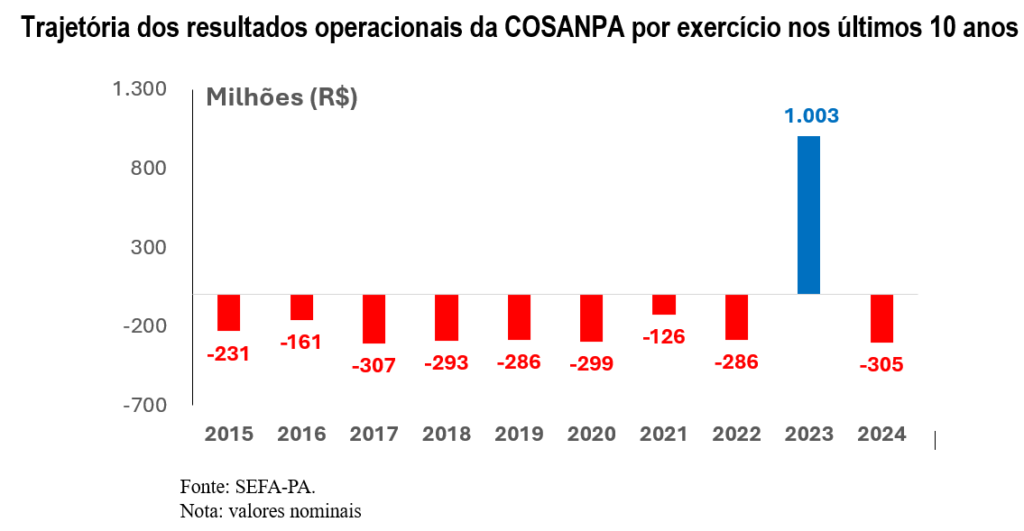 Se corrigirmos todos esses valores apresentados no gráfico pelo IPCA, a preços de dezembro de 2024, a Cosanpa acumulou um rombo da ordem de R$ 2 bilhões só nesses ultimos dez anos, a serem custeados pelos pagadores de impostos, que além de terem que tomar água enferrujada e defecar no buraco, tem que trabalhar para pagar o tamanho desse buraco nas contas públicas do governo paraense.