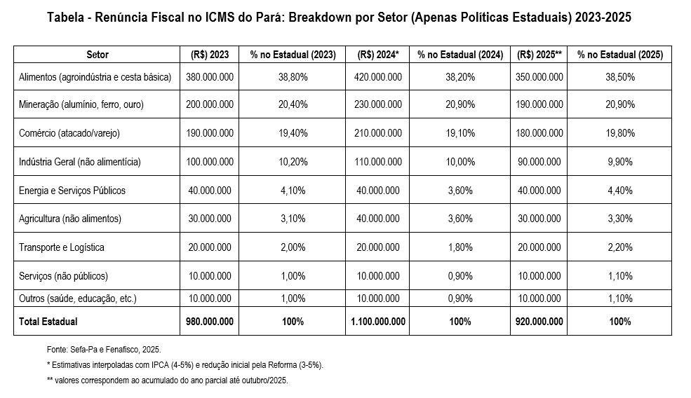 O breakdown setorial revela dependências claras. O setor de alimentos, incluindo agroindústria e cesta básica, lidera com R$ 380 milhões em 2023 (38,8% do total). Mineração – alumínio e ferro – vem logo atrás, com R$ 200 milhões (20,4%), graças a créditos presumidos para insumos importados, como na Hydro de Barcarena, setor que responde por quase 30% do PIB paraense, segundo a Fenafisco.